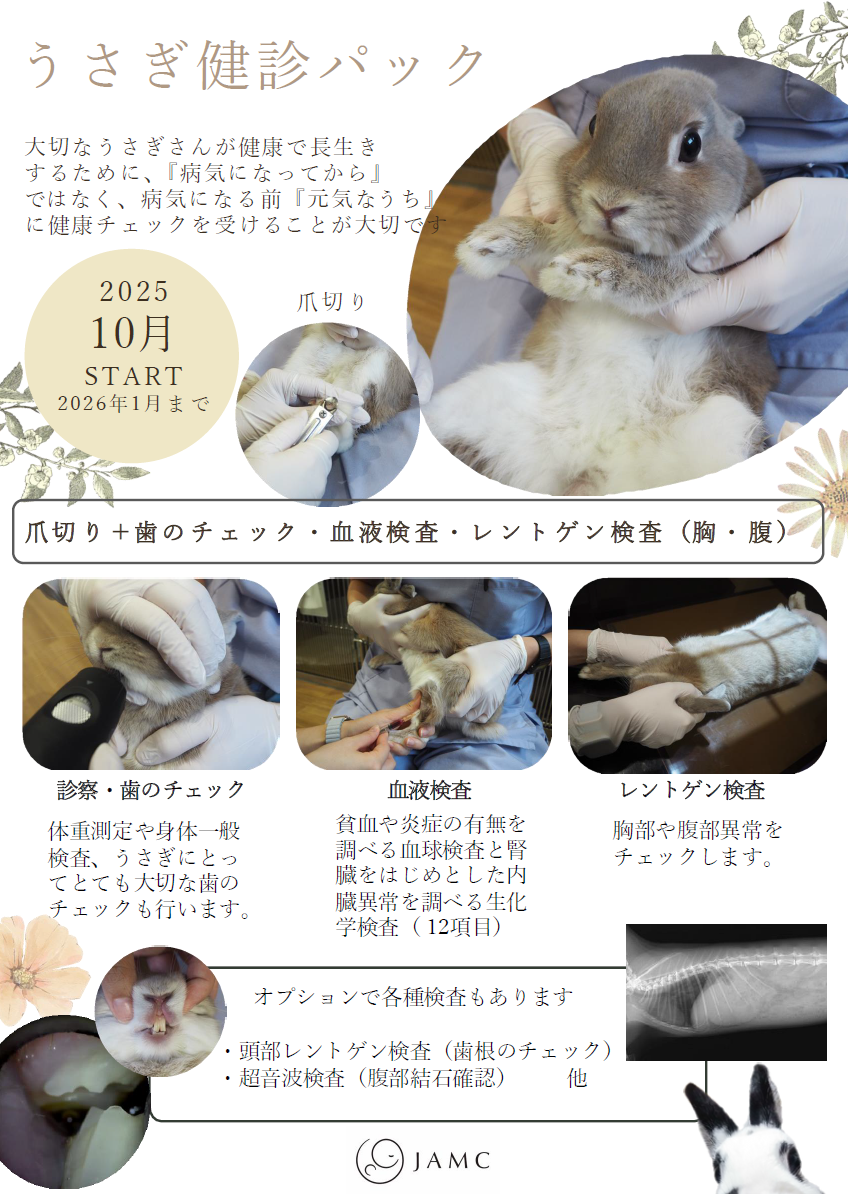 大切なうさぎさんが健康で長生きするために――。 「病気になってから」ではなく、「元気なうち」に定期的な健康チェックを受けることがとても大切です。 当院では2025年10月より、うさぎ専用の 健康診断パック をスタートしました。