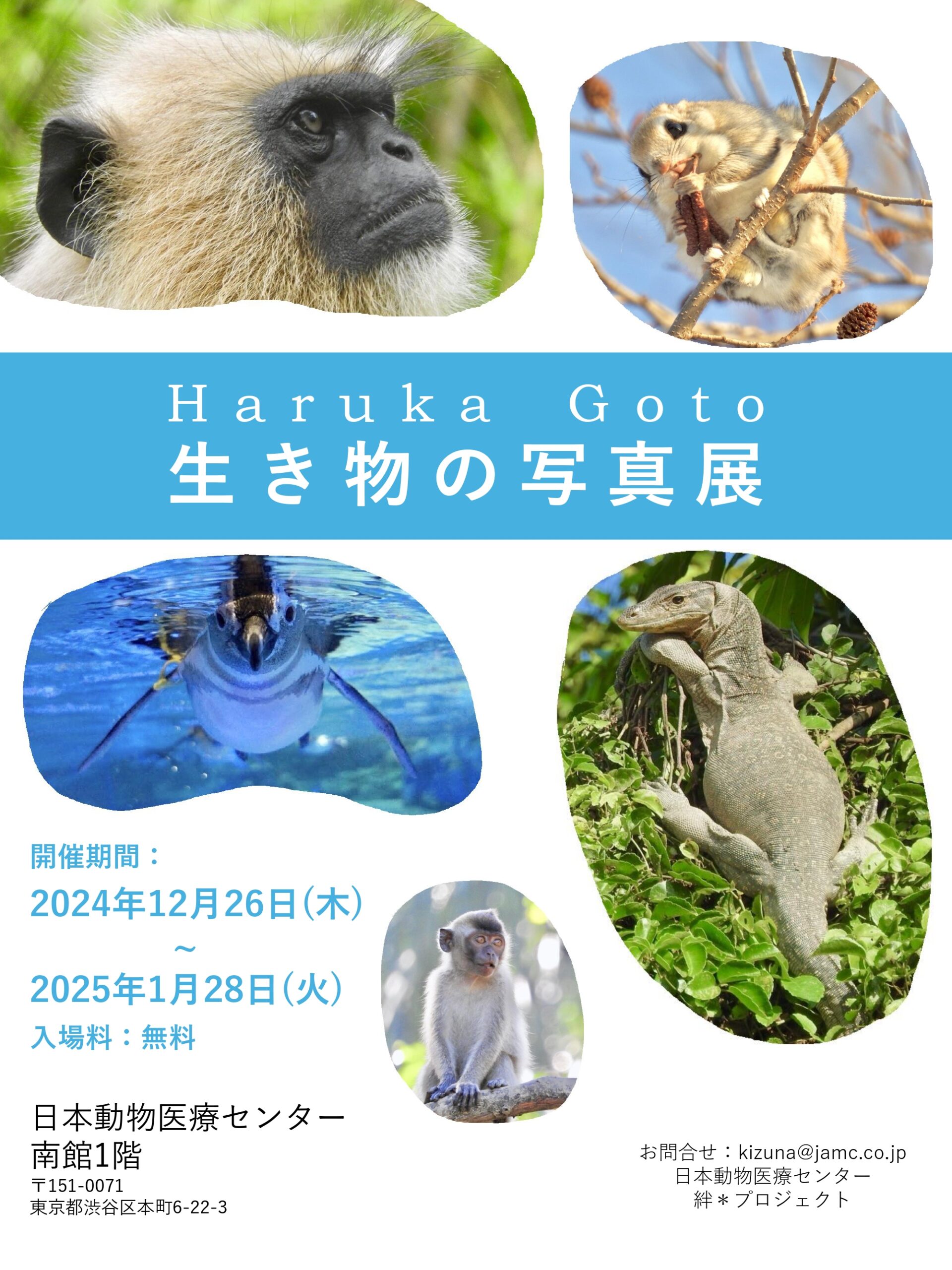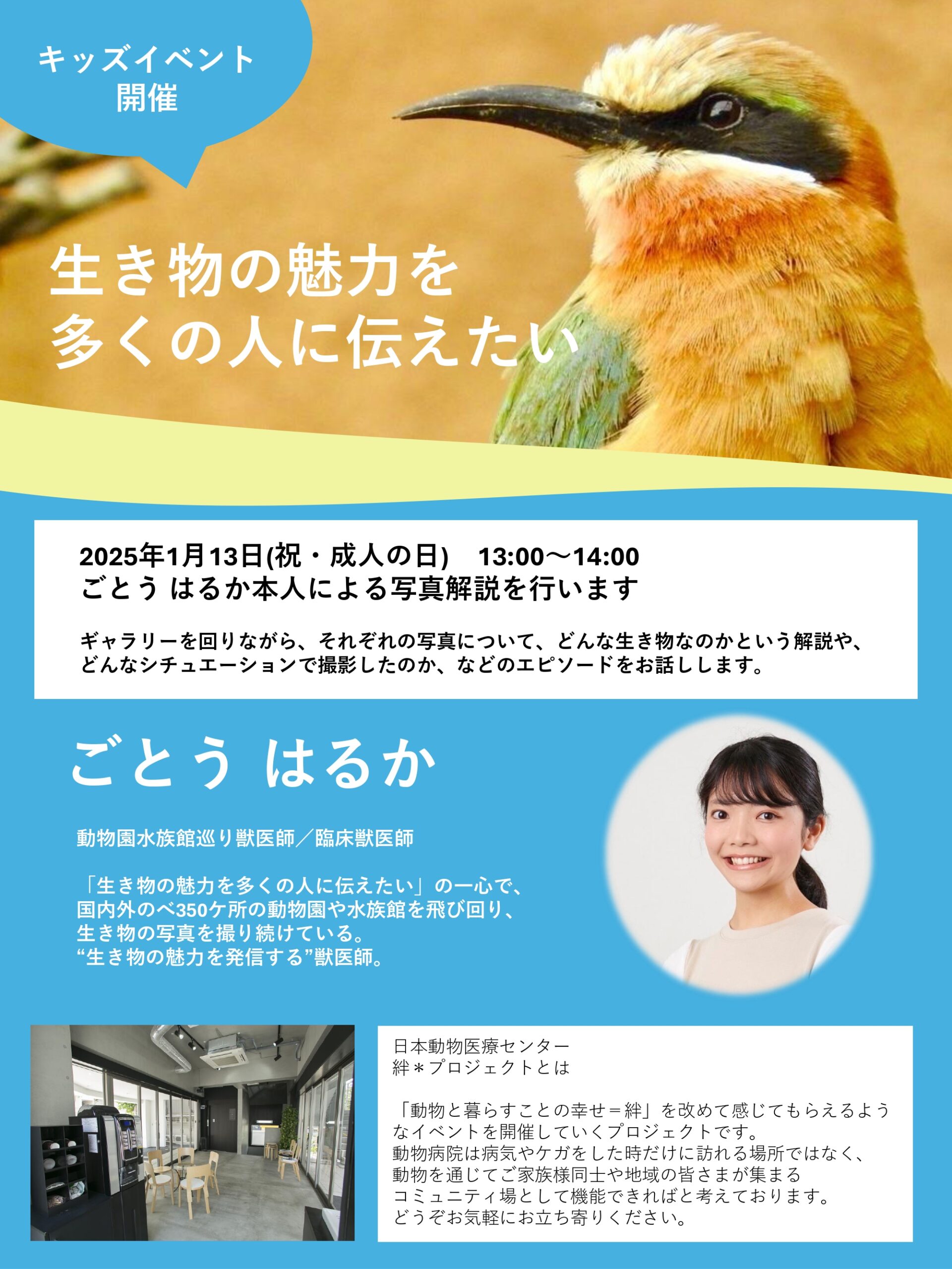 国内外のべ350ケ所の動物園や水族館を飛び回り、生き物の写真を撮り続けている獣医師、ごとうはるかさんによる『生き物の写真展』を開催します。 開催期間 2024年12月26日(木) ~ 2025年1月28日(火) 日本動物医療センター 南館1階 入場無料 キッズイベントを開催 2025年1月13日(祝・成人の日) 13:00~14:00 ギャラリーを回りながら、それぞれの写真について、どんな生き物なのかという解説や、どんなシチュエーションで撮影したのかなどのエピソードをご本人より解説いただきます。※予約不要