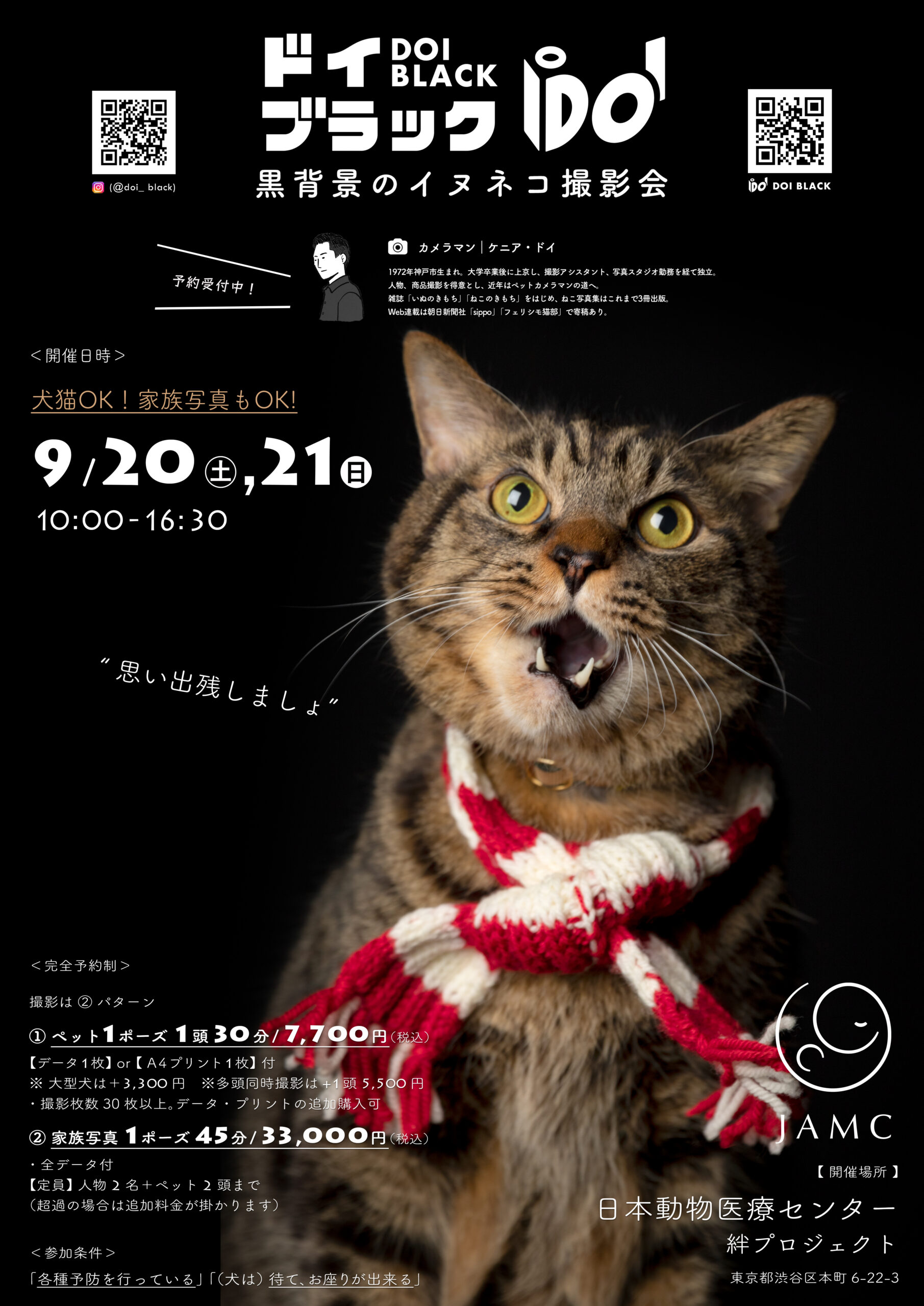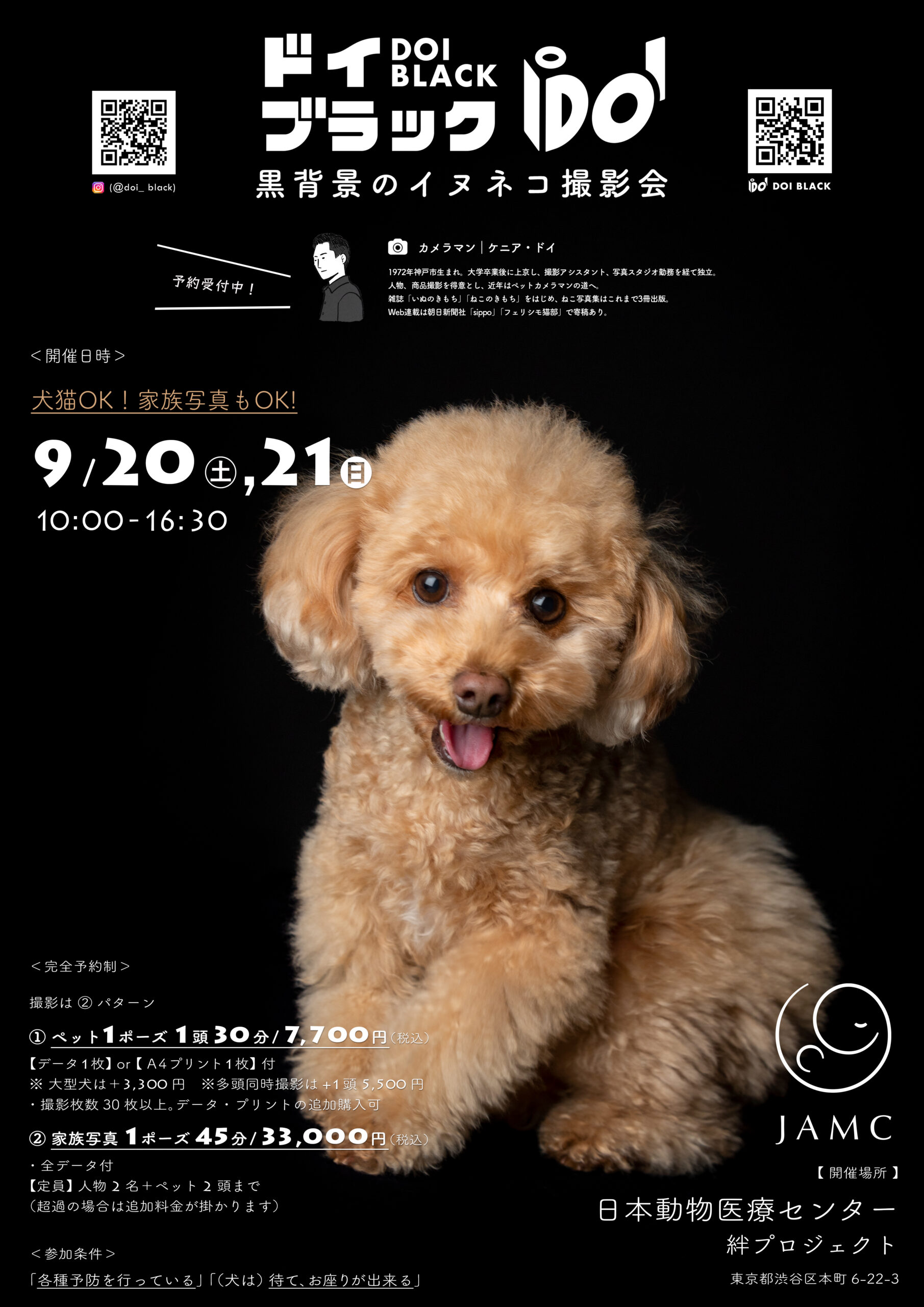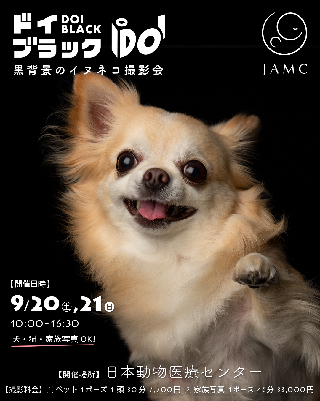開催日時|2025年9月20日(土)-21日(日)10:00-16:30 開催場所|日本動物医療センター @東京都渋谷区本町6-22-3 完全予約制|当日のキャンセルはキャンセル料が発生します 対象動物|犬、猫 撮影料金は②パターン ①ペット1ポーズ 1頭30分/7,700円 【データ1枚】もしくは【A4プリント1枚】付き ※大型犬(20kg以上〜)は+3,300円 ※多頭同時撮影は+1頭につき5,500円 ○1ポーズ30分の内訳(撮影約10分+写真セレクト約20分) ○1ポーズ=1衣装 尚、お友達同士の多頭撮影は料金設定が異なりますので事前にお問い合わせください ②家族写真1ポーズ45分/33,000円 全データ付き 【定員】人物2名+ペット2頭まで ※追加人物&ペット1名(頭)につき+5,500円 ※追加1ポーズ+11,000円(2ポーズまで) ○1ポーズ45分の内訳(打ち合わせ10分+撮影約20分+写真セレクト約15分) ○カメラマンからのご提案→『背景が黒なので衣装は明るい色がオススメ!』 ○1ポーズの定義=「同じ登場人物&ペット」「同じようなフォーメーション」「同じ衣装」
